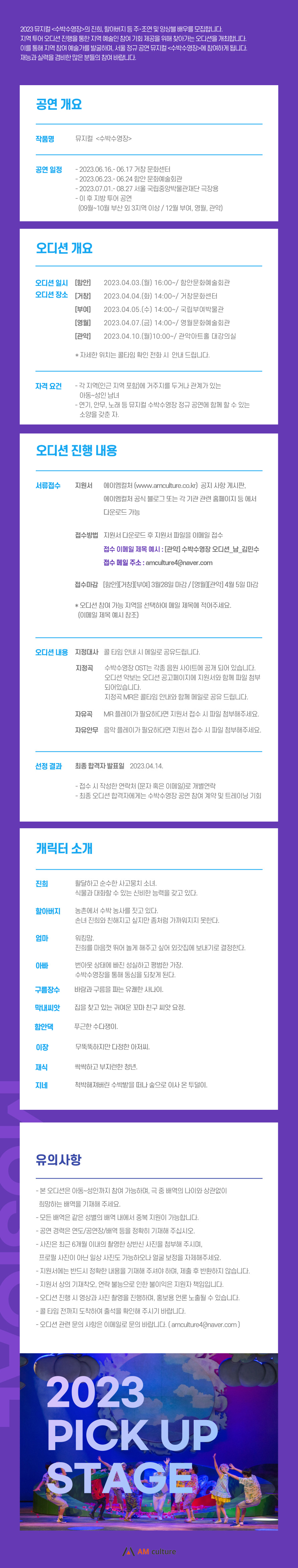 2023 뮤지컬 <수박수영장>의 진희, 할아버지 등 주・조연 및 앙상블 배우를 모집합니다. 지역 투어 오디션 진행을 통한