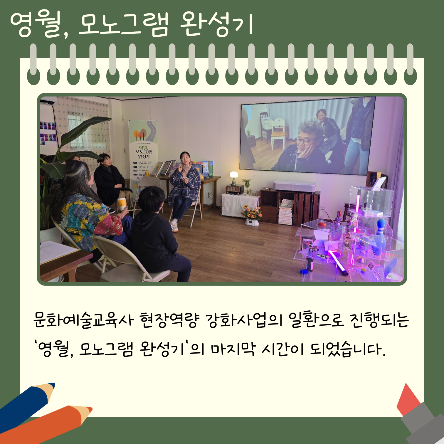 문화예술교육사 현장역량 강화사업의 일환으로 진행되는 '영월, 모노그램 완성기'의 마지막 시간이 되었습니다.