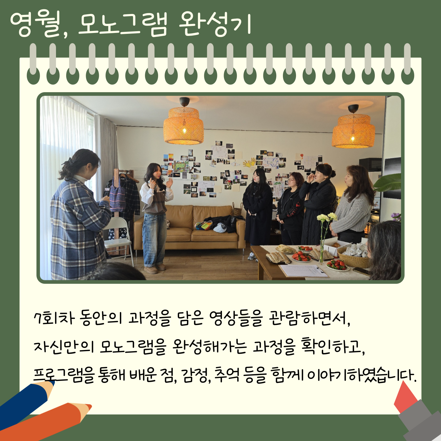 7회차 동안의 과정을 담은 영상들을 관람하면서, 자신만의 모노그램을 완성해가는 과정을 확인하고, 프로그램을 통해 배운 점, 감정, 추억 등을 함께 이야기하였습니다.