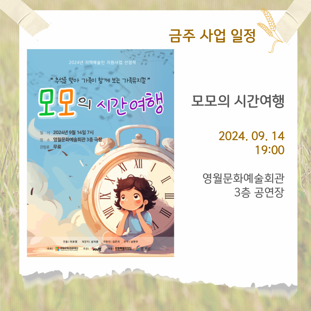 금주 지역예술인 지원사업 일정 안내드립니다.가족 뮤지컬 '모모의 시간여행' 일정 : 2024. 09. 14 / 19:00장소 : 영월문화예술회관 3층 공연장군민 여러분의 많은 관심과 참여 부탁드립니다.#2024지역예술인지원사업 #전문예술인 #공연 #극단시와별 #영월문화예술회관 #뮤지컬 #모모 #9월 #영월