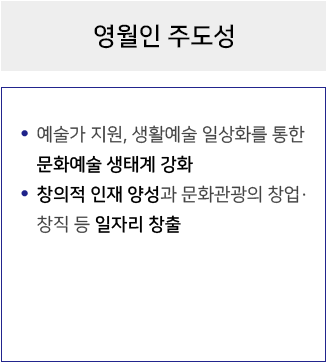 지역주민의 문화예술 향유권을 보장하고, 주민 중심의 문화도시 생태계를 구축하기 위해 노력합니다. 지역 고유의 자원을 바탕으로 문화와 경제가 상생하는 영월을 만듭니다.
