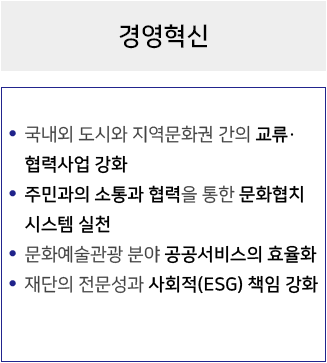 하나, 우리는 문화예술관광 분야의 공공서비스 제공자로서 투명하면서 효율적인 경영체계 확립과 윤리경영을 지속적으로 추진하겠습니다.
