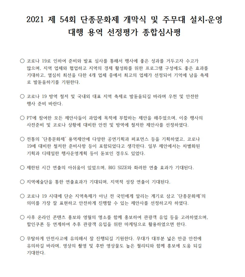 제54회 단종문화제 개막식 및 주무대 설치 ·운영 대행 용역 선정결과 발표