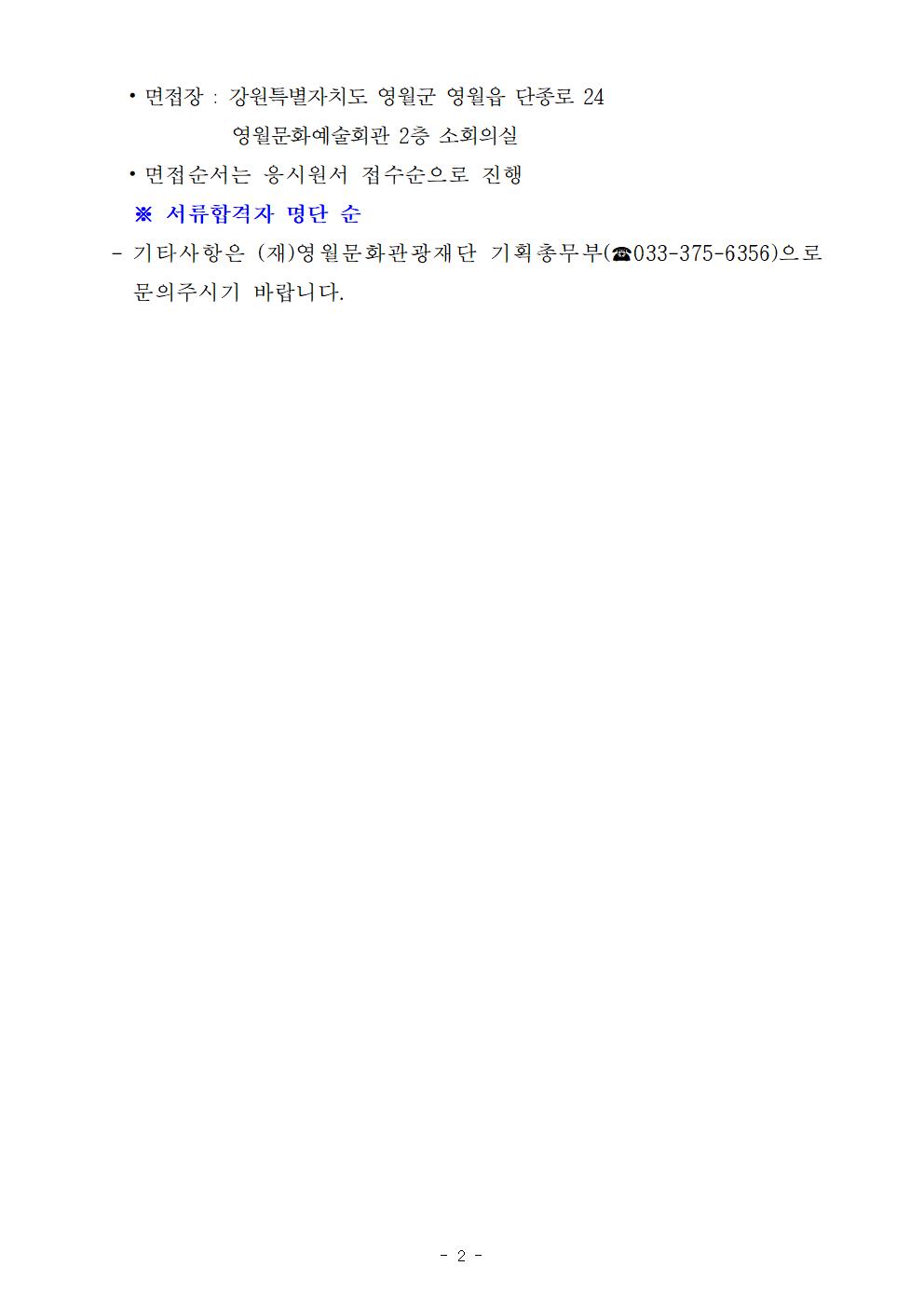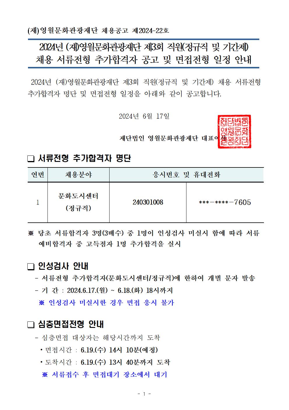 2024년 (재)영월문화관광재단 제3회 직원(정규직 및 기간제) 채용 서류전형 추가합격자 공고 및 면접전형 일정 안내