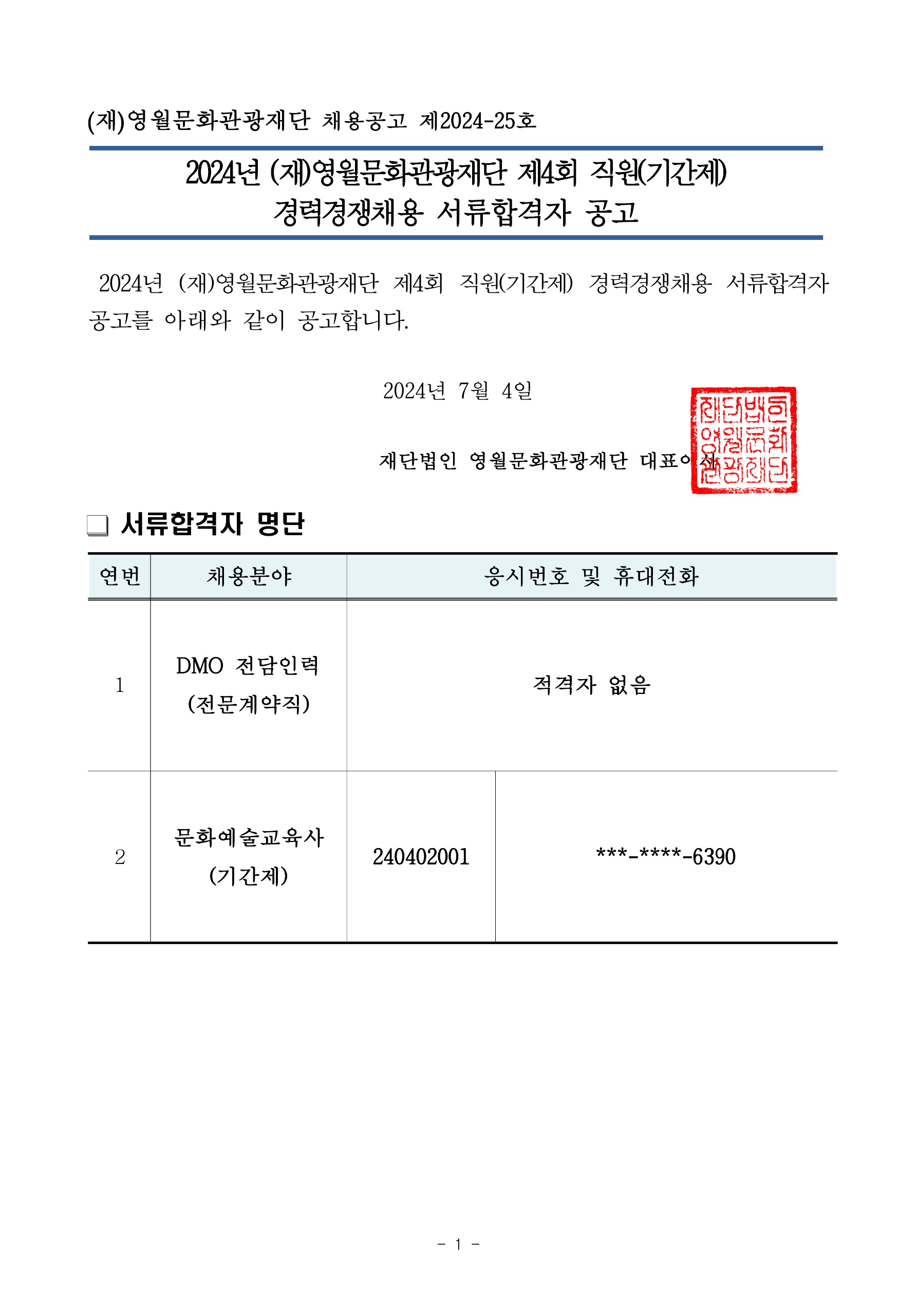 2024년 재영월문화관광재단 제4회 직원기간제 경력경쟁채용 서류합격자 공고_1.jpg