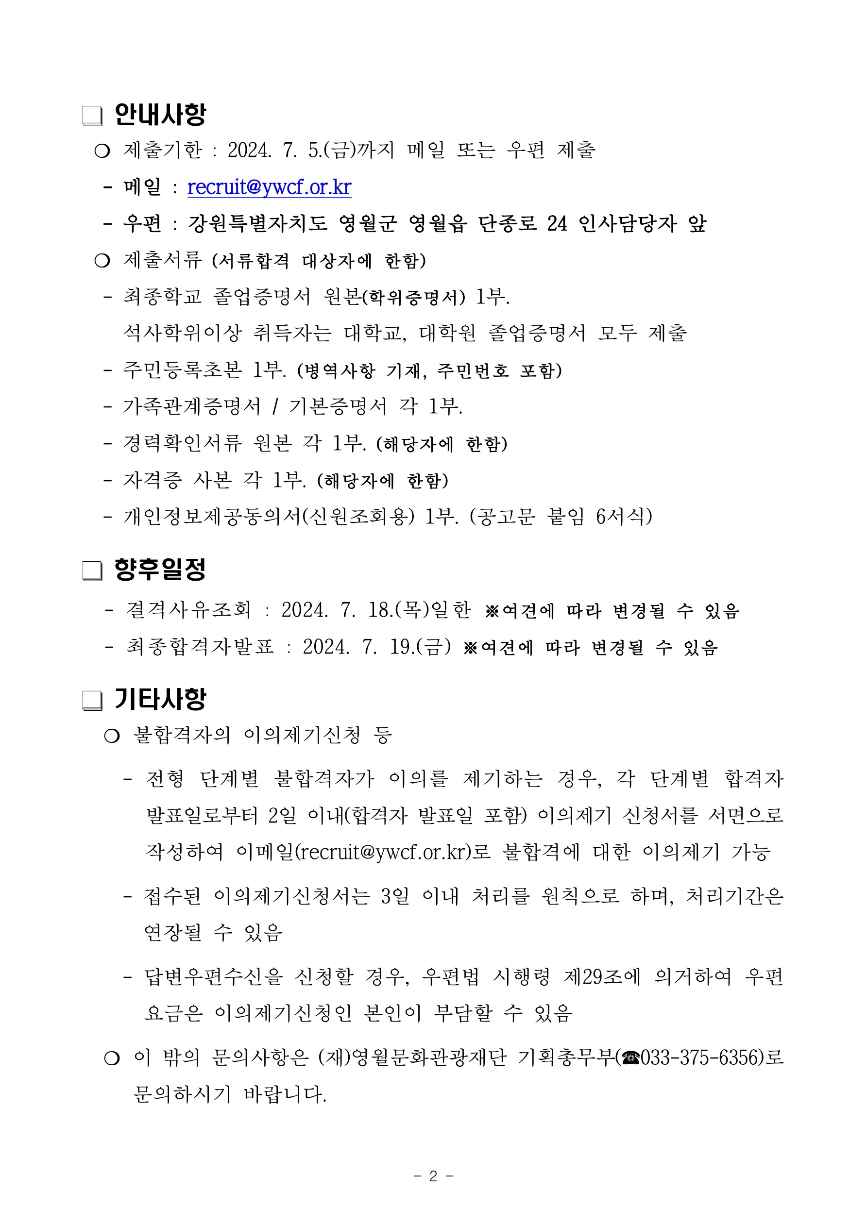 2024년 (재)영월문화관광재단 제4회 직원(기간제) 경력경쟁채용 서류합격자 공고