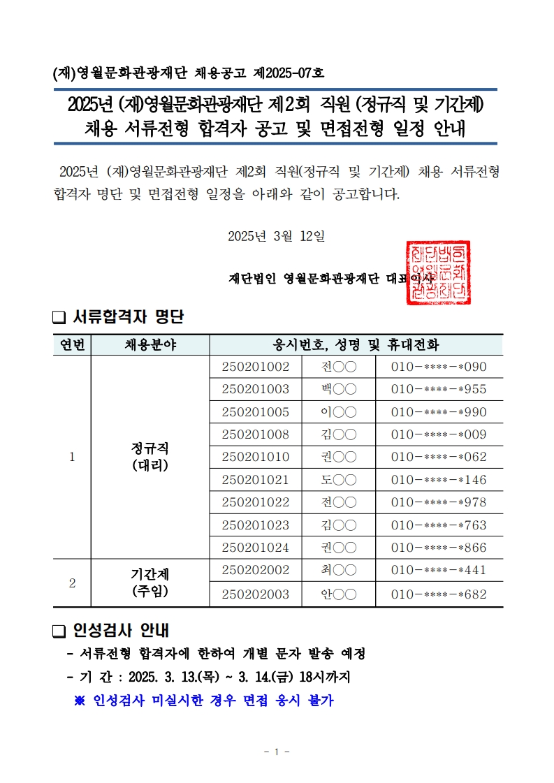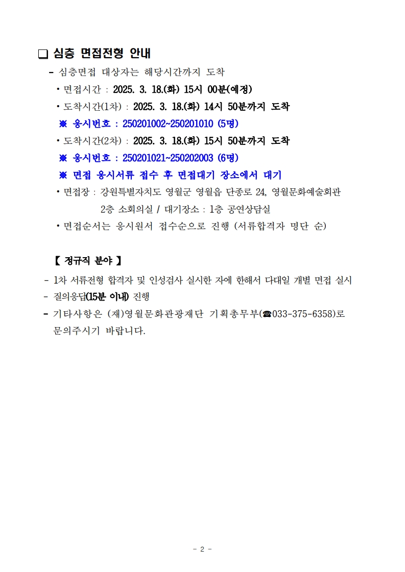 2025년 (재)영월문화관광재단 제2회 직원(정규직 및 기간제) 채용 서류전형 합격자 공고 및 면접일정 안내