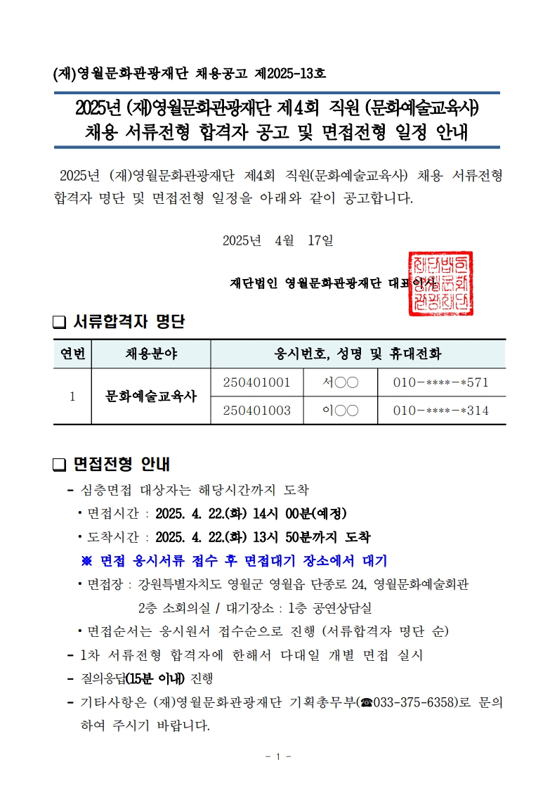 2025년 (재)영월문화관광재단 제4회 직원(문화예술교육사) 채용 최종합격자 공고
