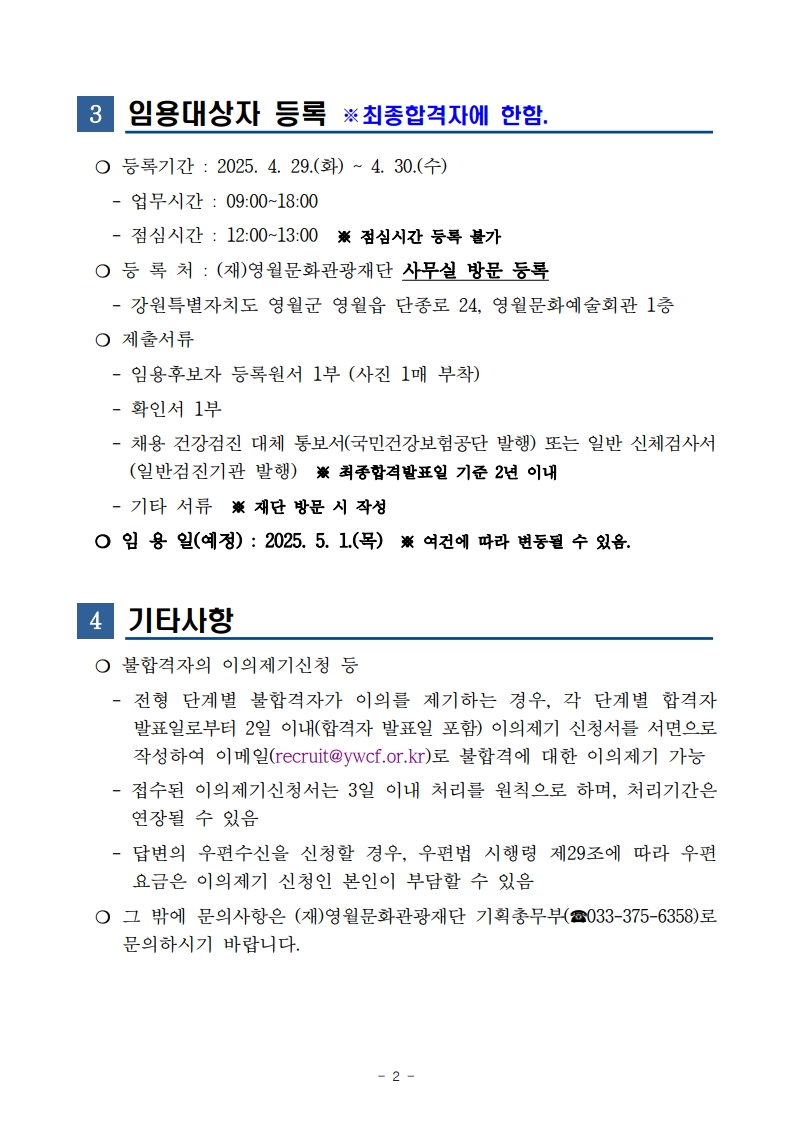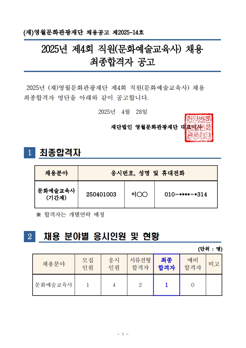 2025년 (재)영월문화관광재단 제4회 직원(문화예술교육사) 채용 최종합격자 공고