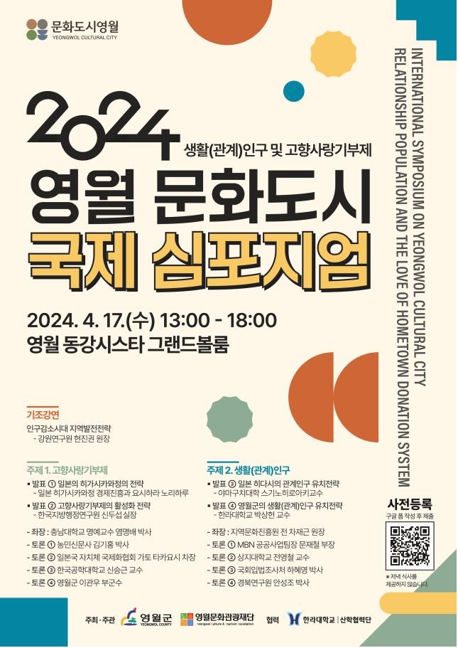 이번 심포지엄에서는 생활(관계)인구를 확대하여 영월군 활력 증진 방안과 고향사랑기부제 관련 정책개발, 해외 추진사례, 발전 방향 등에 대해 논의할 예정이다.