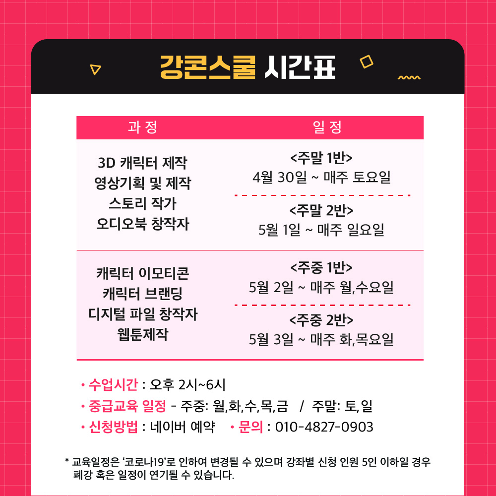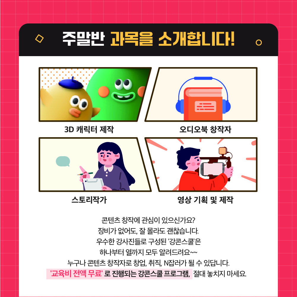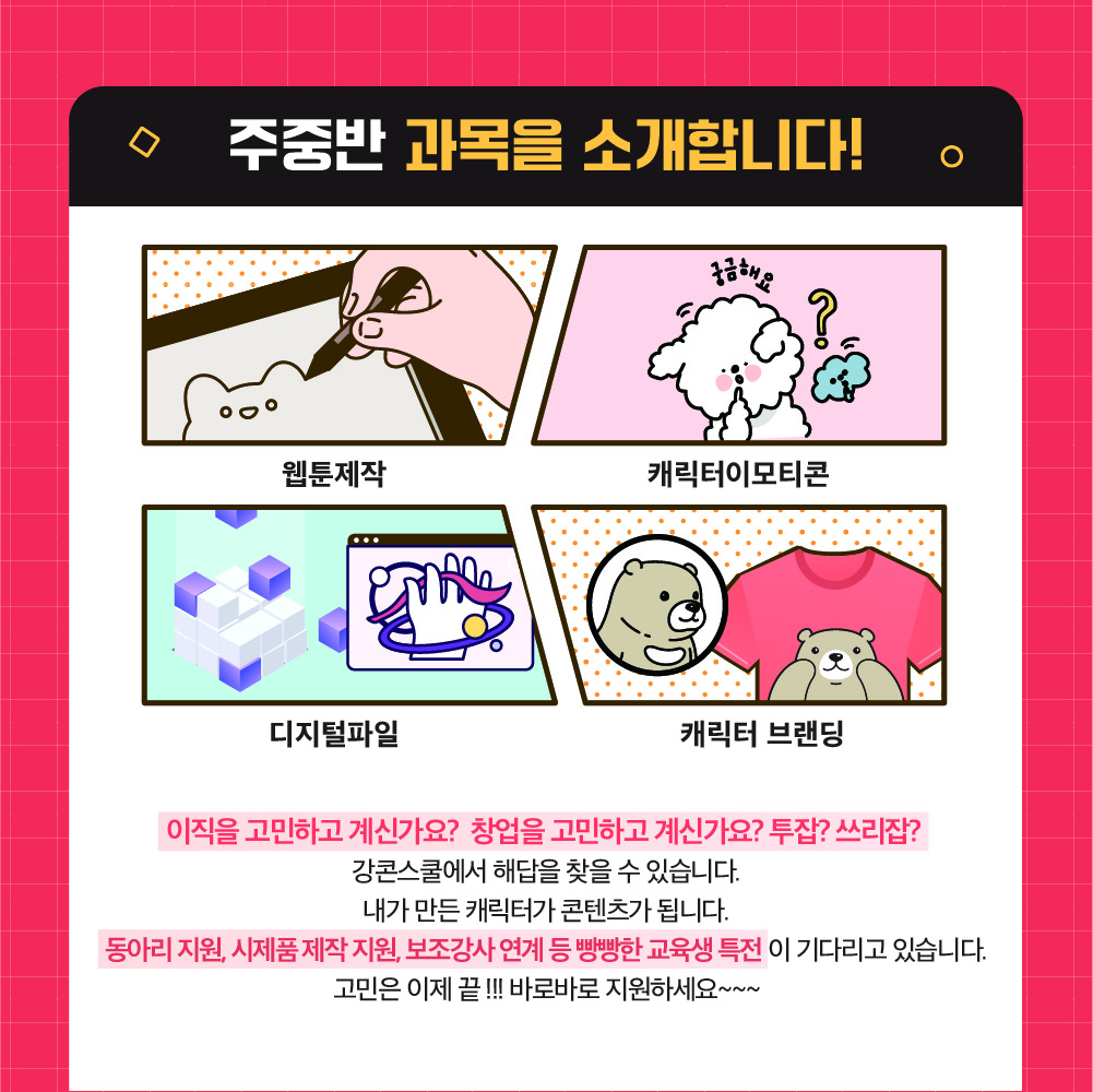 가. 평일 : 웹툰제작, 캐릭터, 이모티콘 제작, 디지털파일 창작, 캐릭터브랜딩