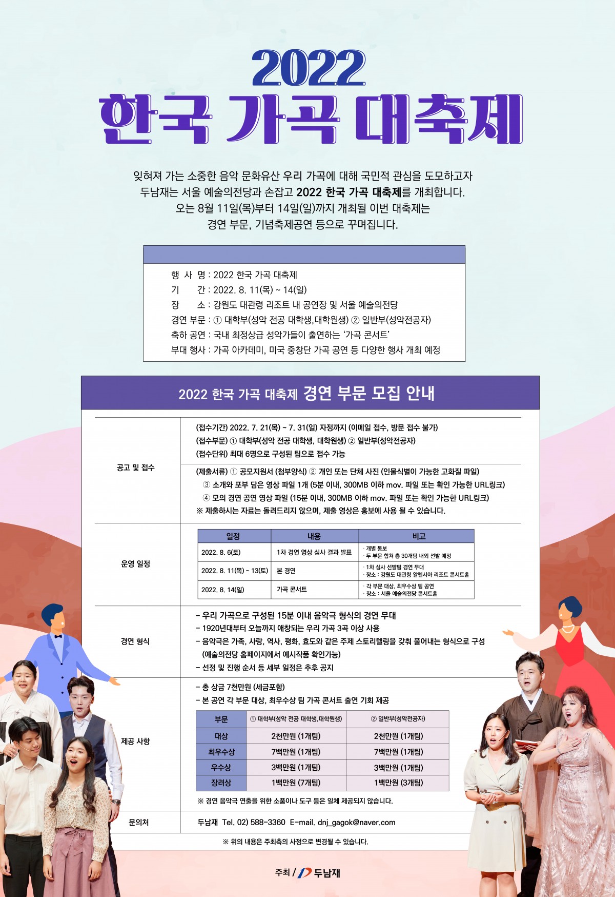 우리 가곡으로 이야기가 있는 극을 구성하여 색다른 볼거리와 즐거움을 선사할 <2022 한국 가곡 대축제>에 많은 관심과 참여 부탁드립니다.