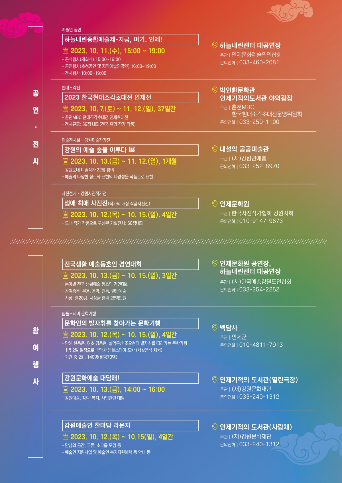 강원예술인의 문화 공유와 소통의 장인 「2023년 강원예술인 한마당」이 2023.10. 12.(목) 18:00 개막식을 시작으로 10.15.(일)까지 인제군 일원에서 개최됩니다.