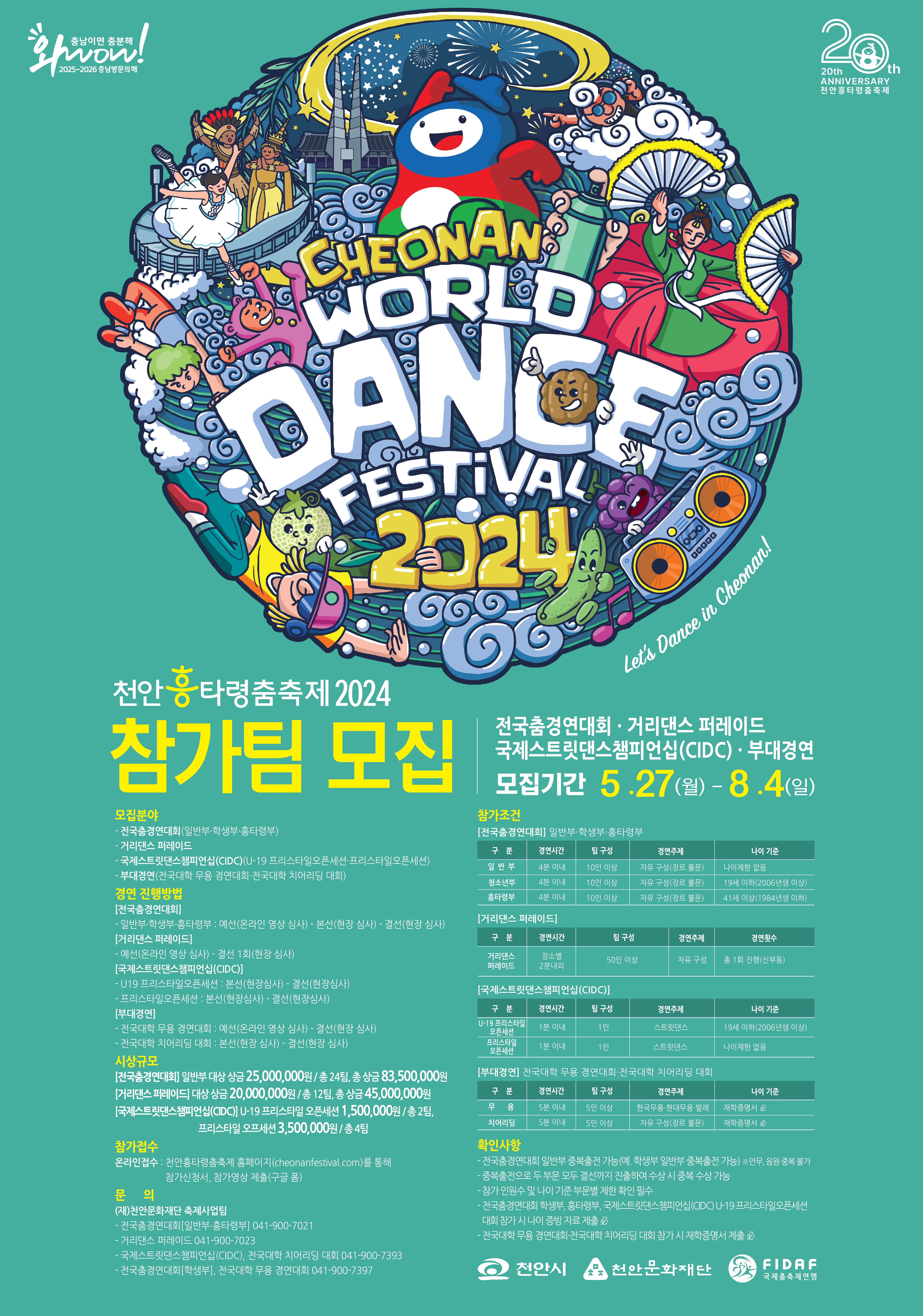 「천안흥타령춤축제 2024」 주요 프로그램인 전국춤경연대회, 거리댄스 퍼레이드 등 춤 경연 참가팀을 다음과 같이 모집하오니, 많은 참여 바랍니다.