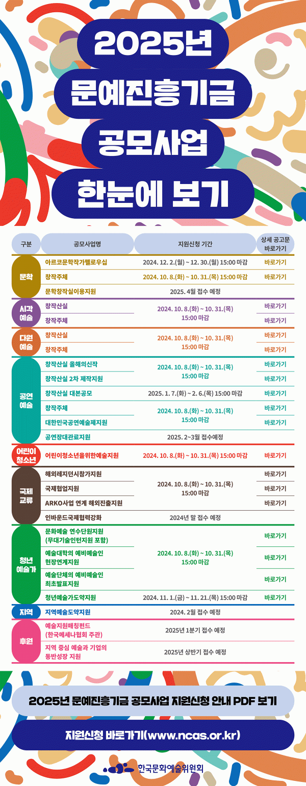 2025년 한국문화예술위원회 문예진흥기금사업을 안내드립니다.