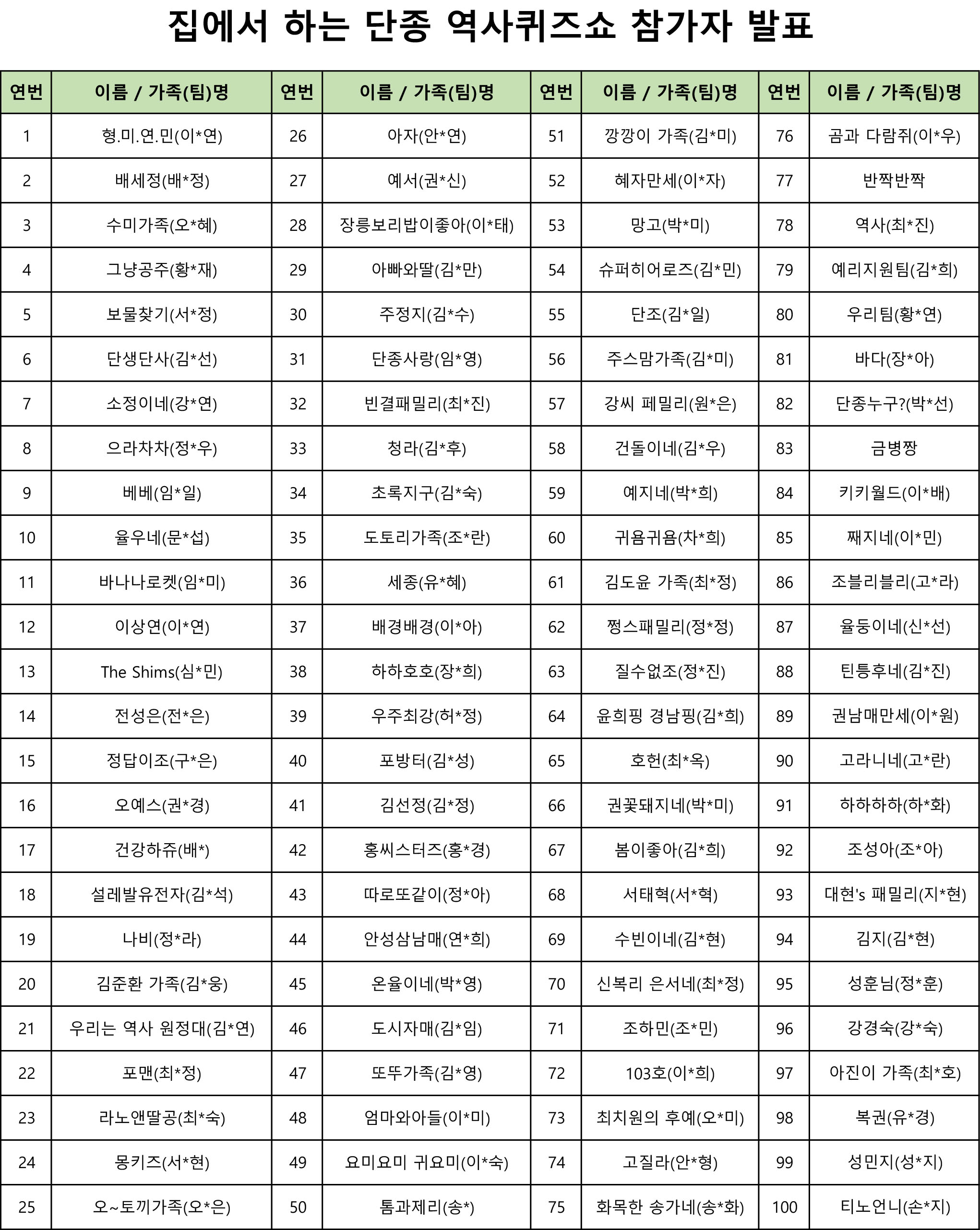 붙임. 집에서 하는 단종 역사 퀴즈쇼 참가자 발표 1부. 끝.