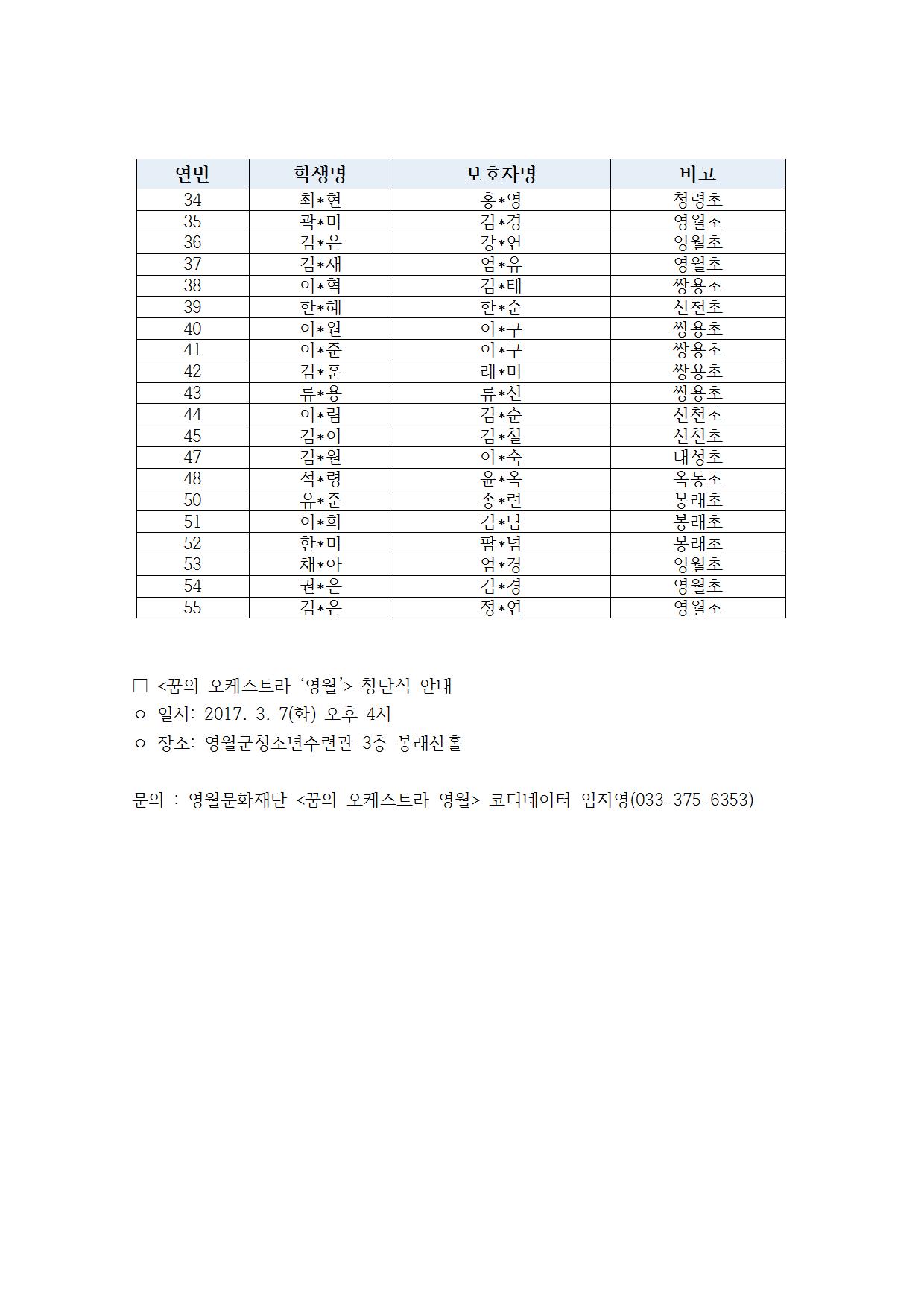 2017 꿈의 오케스트라 '영월' 교육단원 최종 합격자공고