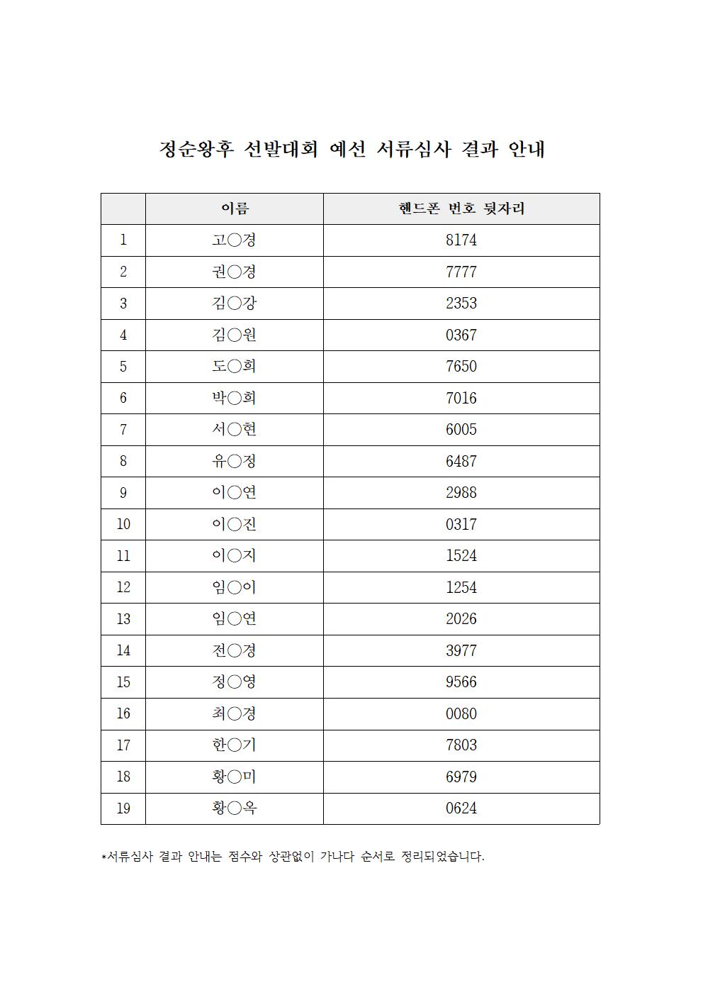 제23회 정순왕후 선발대회 예선 서류심사 결과 재안내