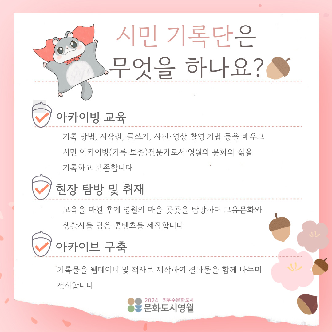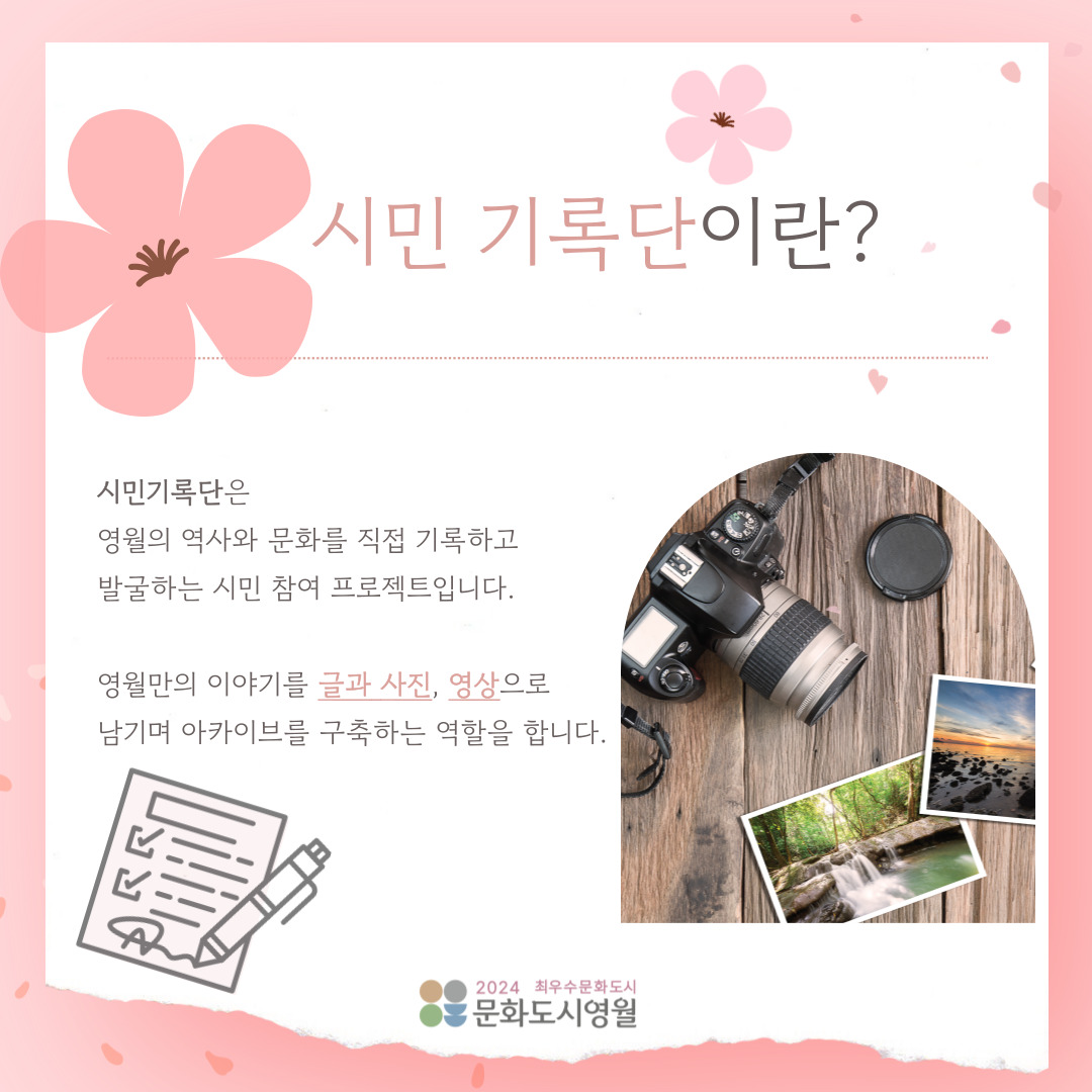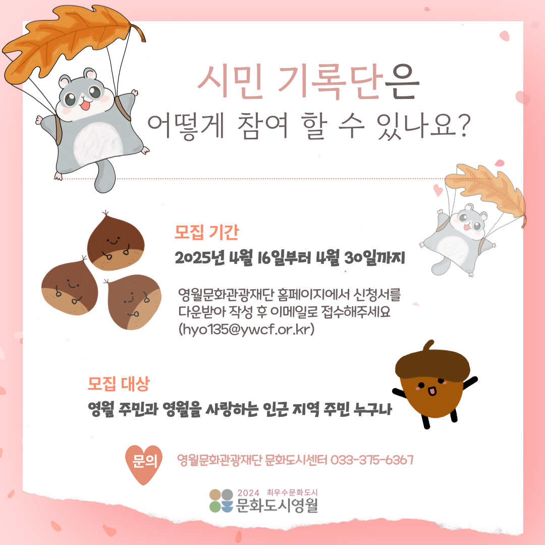 영월의 기억을 담아낼 「영월 시민기록단」에 관심 있는 분들의 많은 참여를 부탁드립니다.