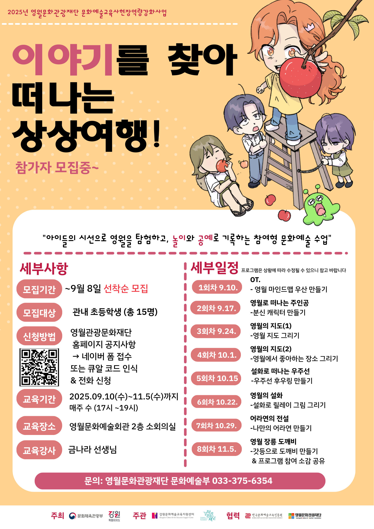 재단법인 영월문화예술관광재단에서는 2025년 문화예술교육사 현장역량 강화사업의 일환으로 지역 특성화 문화예술교육 프로그램 <이야기를 찾아 떠나는 상상여행 2기>에 참여할 참가자를 모집하고 있습니다. 여러분의 많은 관심과 참여를 바랍니다.